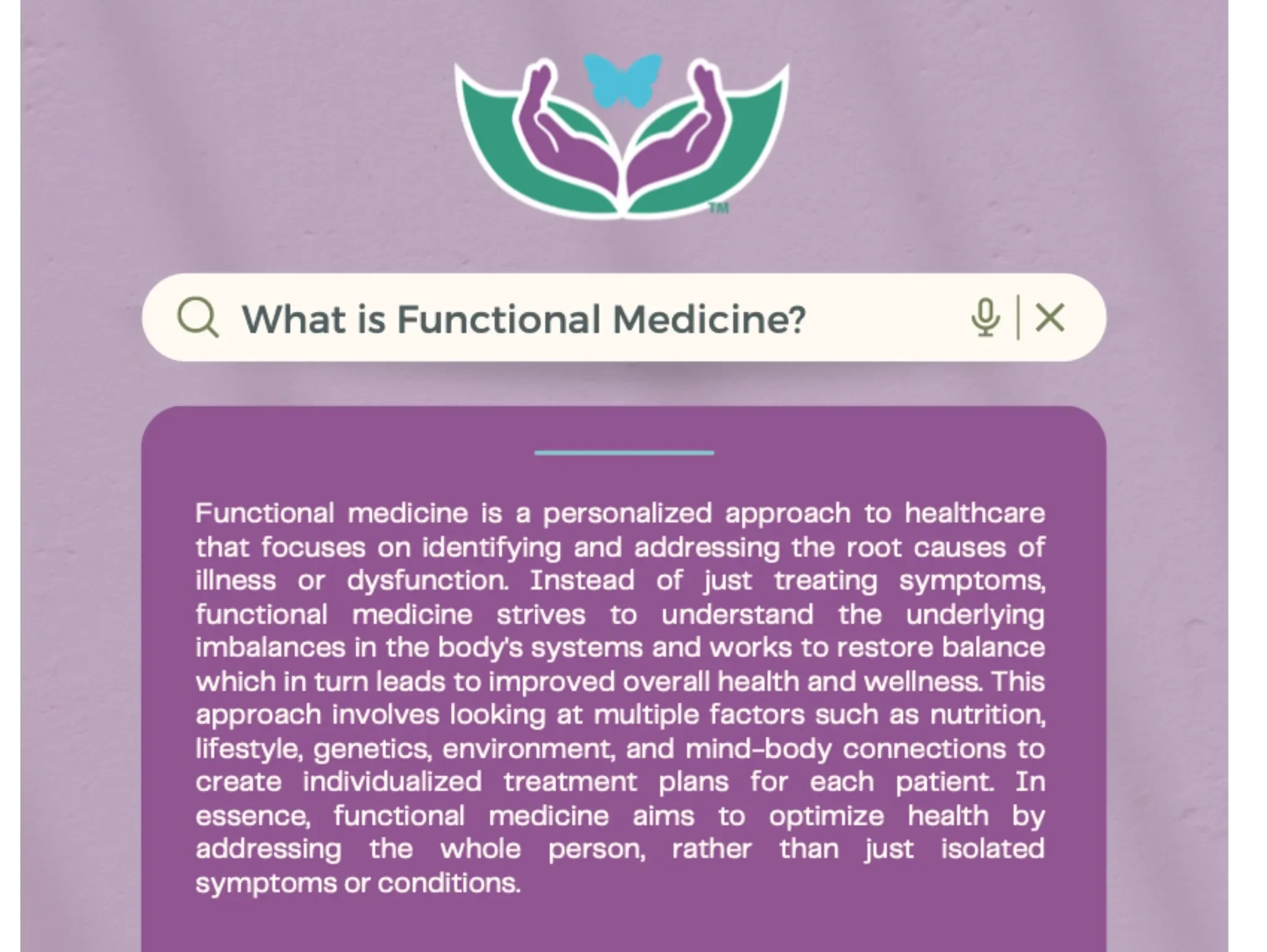 Functional Medicine seeks to address the root cause of your symptoms, not just the symptoms themselves.